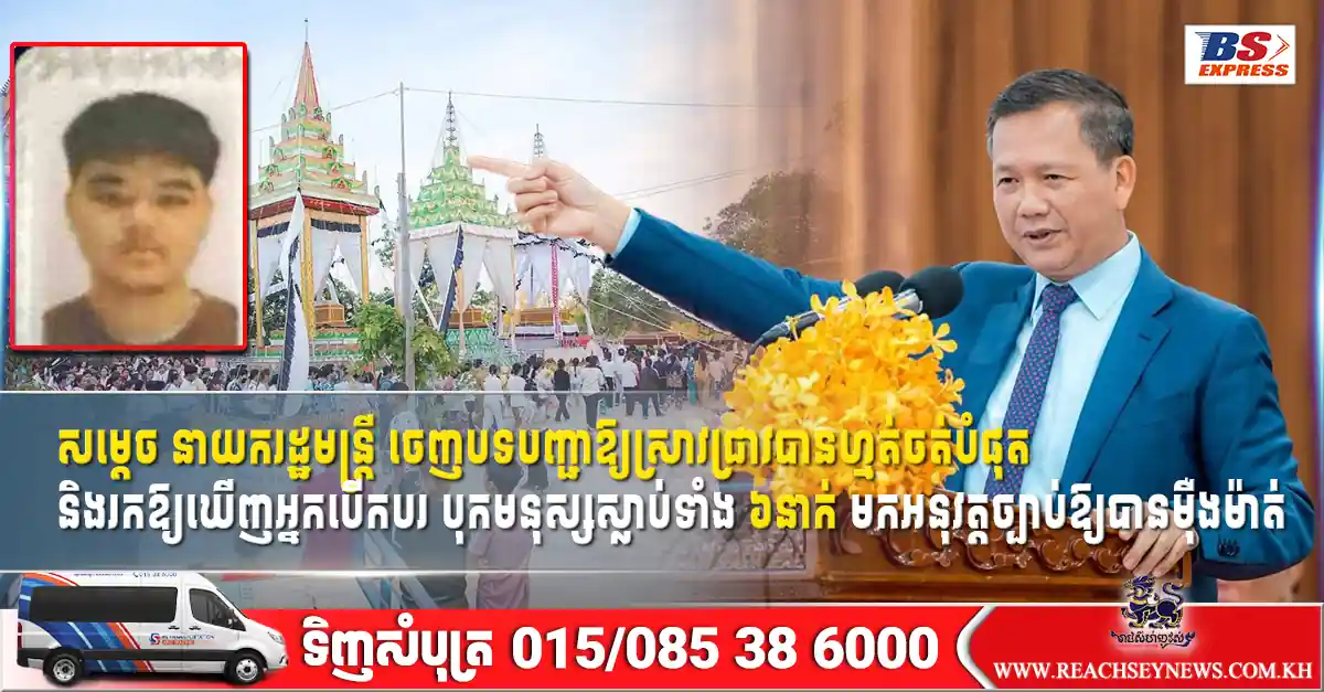 ភ្នំពេញ ៖ សម្តេចធិបតី ហ៊ុន ម៉ាណែត នាយករដ្ឋមន្ត្រីនៃកម្ពុជា បានចេញបទបញ្ជាឱ្យក្រសួងយុត្តិធម៌ និងអគ្គស្នងការនគរបាលជាតិ ត្រូវធ្វេីការស្រាវជ្រាវឱ្យបានហ្មត់ចត់បំផុត និងរកឱ្យឃេីញអ្នកដែលបេីកបររថយន្តពិតប្រាកដ ដែលបុកមនុស្សស្លាប់ទាំង៦នាក់ ហើយអនុវត្តច្បាប់ឱ្យបានម៉ឺងម៉ាត់ ។