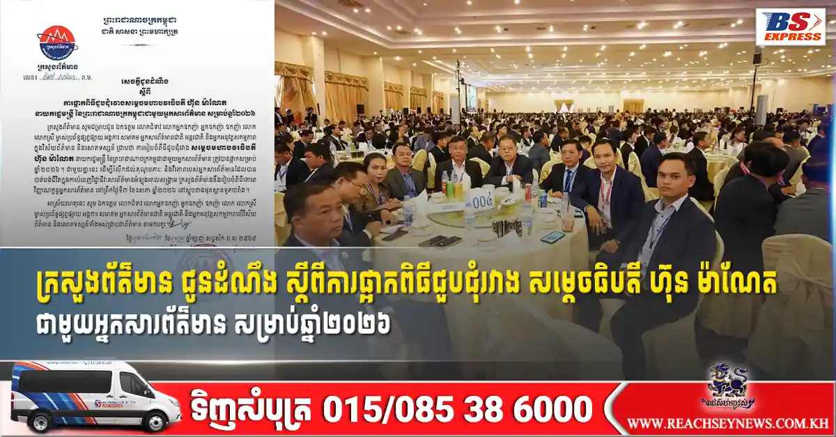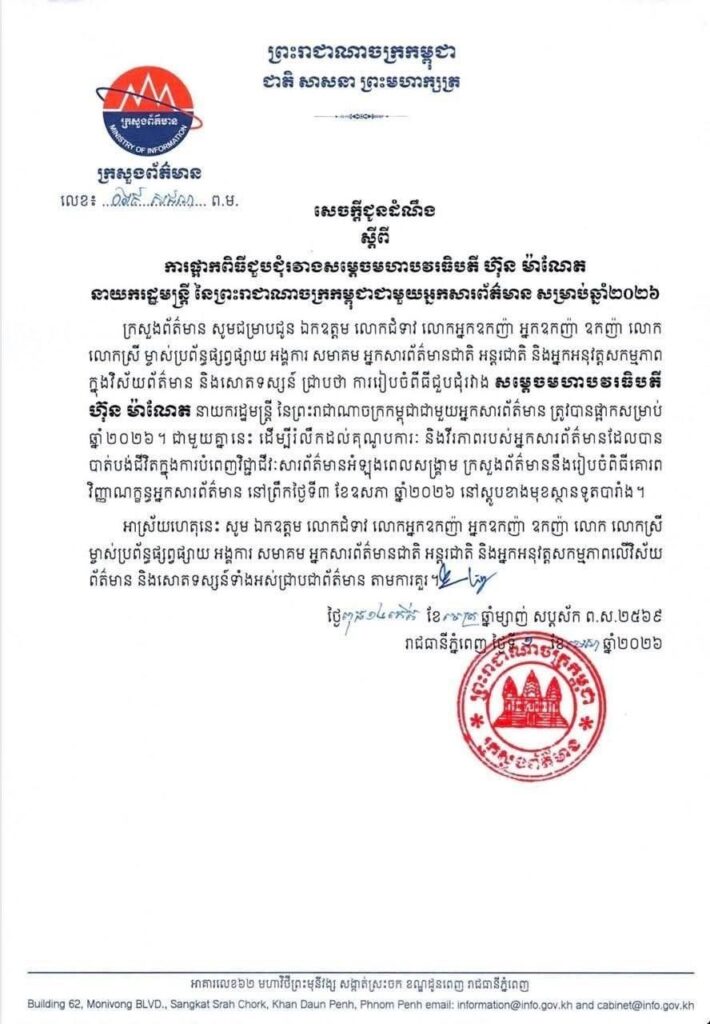 ក្រសួងព័ត៌មាន ជូនដំណឹង ស្ដីពីការផ្អាកពិធីជួបជុំរវាង សម្តេចធិបតី ហ៊ុន ម៉ាណែត ជាមួយអ្នកសារព័ត៌មាន សម្រាប់ឆ្នាំ២០២៦
