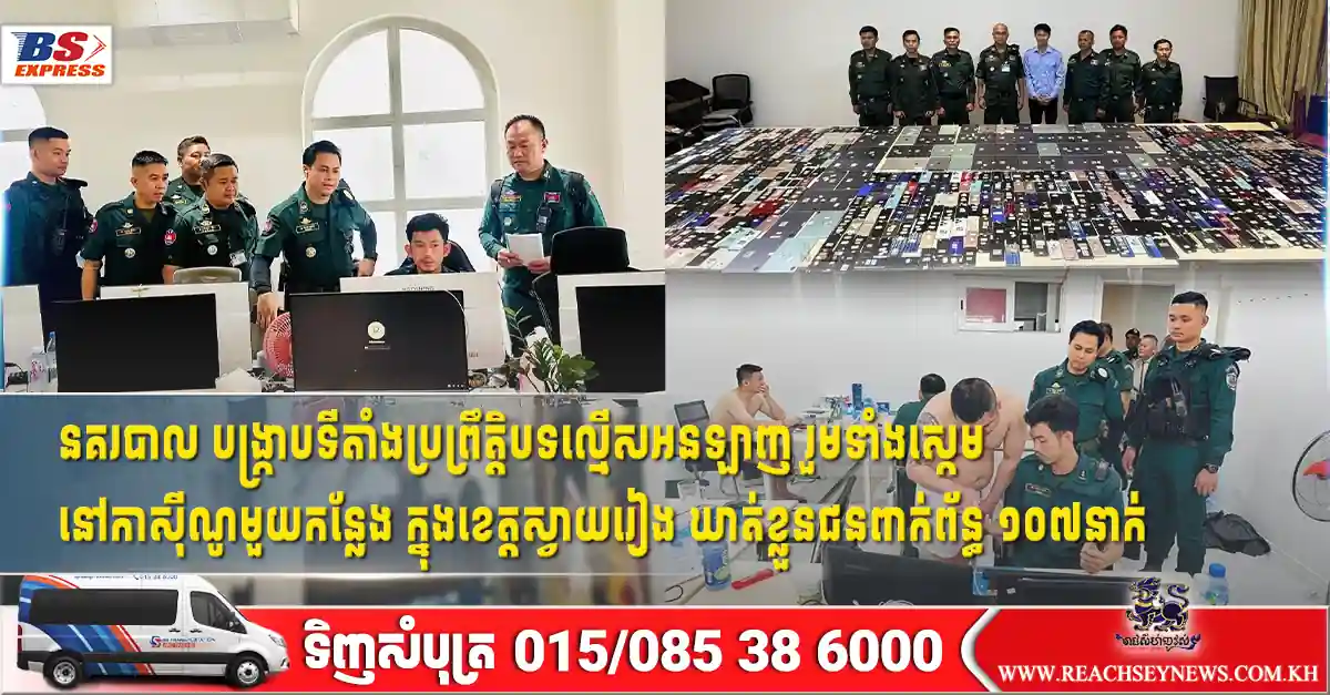 នគរបាល បង្ក្រាបទីតាំងប្រព្រឹត្តិបទល្មើសអនឡាញ រួមទាំងស្កេម នៅកាស៊ីណូមួយកន្លែង ក្នុងខេត្តស្វាយរៀង ឃាត់ខ្លួនជនពាក់ព័ន្ធ ១០៧នាក់