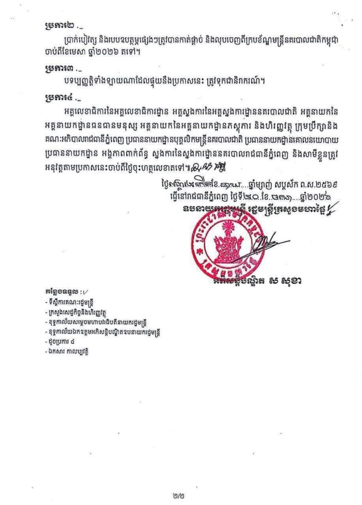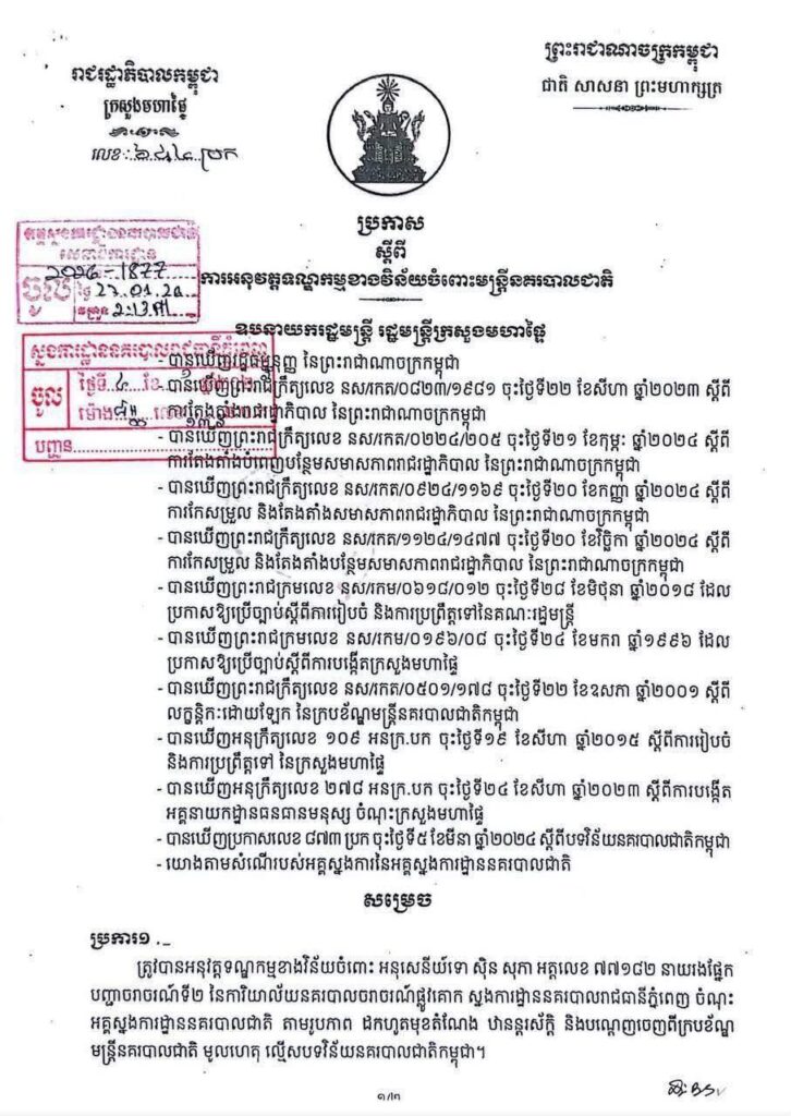 ភ្នំពេញ ៖ លោកឧបនាយករដ្ឋមន្ដ្រី ស សុខា រដ្ឋមន្ដ្រីក្រសួងមហាផ្ទៃ បានចេញសេចក្ដីសម្រេចដាក់ទណ្ឌកម្មខាងវិន័យចំពោះ អនុសេនីយ៍ទោ ស៊ិន សុភា នាយរងផ្នែក បញ្ជាចរាចរណ៍ទី២ នៃការិយាល័យនគរបាលចរាចរណ៍ផ្លូវគោក ស្នងការដ្ឋាននគរបាលរាជធានីភ្នំពេញ ចំណុះអគ្គស្នងការដ្ឋាននគរបាលជាតិ តាមរូបភាព ដកហូតមុខតំណែង ឋានន្តរស័ក្តិ និងបណ្តេញចេញពីក្របខ័ណ្ឌមន្ត្រីនគរបាលជាតិ មូលហេតុ ល្មើសបទវិន័យនគរបាលជាតិកម្ពុជា៕