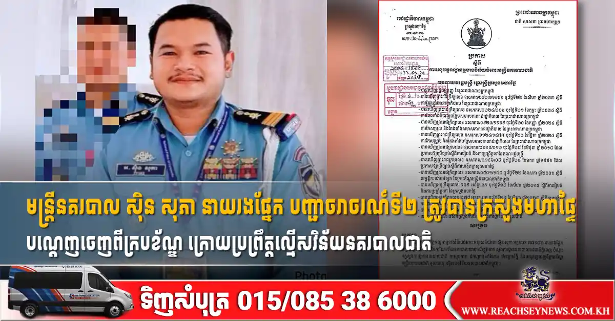 មន្ដ្រីនគរបាល ស៊ិន សុភា នាយរងផ្នែក បញ្ជាចរាចរណ៍ទី២ ត្រូវបានក្រសួងមហាផ្ទៃបណ្តេញចេញពីក្របខ័ណ្ឌ ក្រោយប្រព្រឹត្តល្មើសវិន័យនគរបាលជាតិ