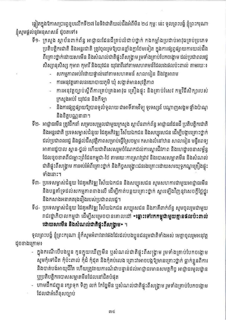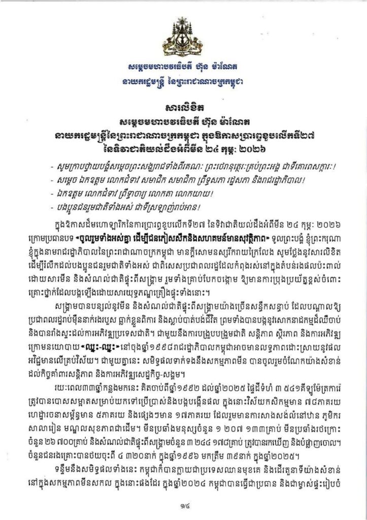 តាមសារលិខិតក្នុងឱកាសប្រារព្ធខួបលើកទី២៧ នៃទិវាជាតិយល់ដឹងអំពីមីន (២៤ កុម្ភៈ ២០២៦) ក្រោមប្រធានបទ «ចូលរួមទាំងអស់គ្នា ដើម្បីជនភៀសសឹក និងសហគមន៍មានសុវត្ថិភាព» សម្ដេចធិបតី ហ៊ុន ម៉ាណែត បានគូសបញ្ជាក់ថា «ក្នុងករណីបើបងប្អូន កូនក្មួយឃើញមីន ឬសំណល់ជាតិផ្ទុះពីសង្គ្រាម រួមទាំងគ្រាប់បែកចង្កោម សូមកុំទៅជិត កុំប៉ះពាល់ កុំដំ កុំដុត និងកុំគប់លេង ព្រោះវាអាចបង្កឱ្យមានគ្រោះថ្នាក់ ធ្លាក់ខ្លួនពិការ និងបាត់បង់អាយុជីវិត ហើយត្រូវរាយការណ៍ជាបន្ទាន់ដល់អាជ្ញាធរមានសមត្ថកិច្ច អាជ្ញាធរមូលដ្ឋាន ឬប្រតិបត្តិករបោសសម្អាតមីនដែលនៅជិតបំផុត។ ហាមដឹកជញ្ជូន រក្សាទុក ទិញ លក់ កែច្នៃមីន ឬសំណល់ជាតិផ្ទុះពីសង្គ្រាម រួមទាំងគ្រាប់បែកចង្កោម ដែលជាអំពើខុសច្បាប់»។