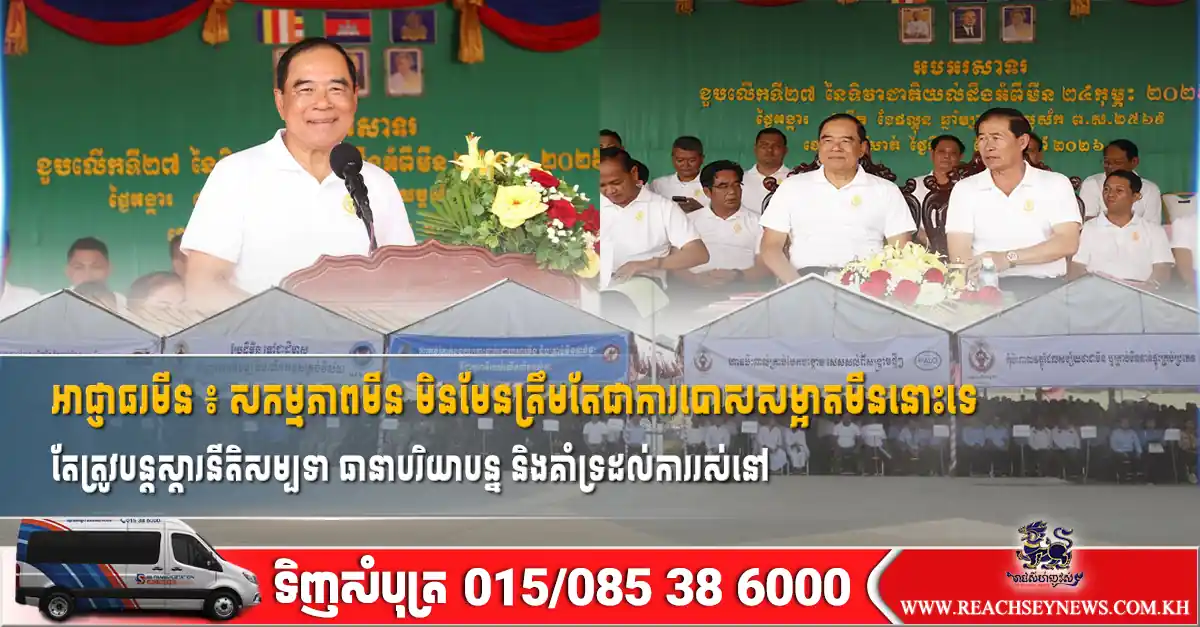 ក្នុងឱកាសប្រារព្ធខួបលើកទី២៧ នៃទិវាជាតិយល់ដឹងអំពីមីន ២៤ កុម្ភៈ ក្រោមប្រធានបទ «ចូលរួមទាំងអស់គ្នា ដើម្បីជនភៀសសឹកនិងសហគមន៍មានសុវត្ថិភាព» នៅថ្ងៃទី២៤ ខែកុម្ភៈ ឆ្នាំ២០២៦ លោកទេសរដ្ឋមន្រ្តី លី ធុជ បានលើកឡើងថា «ការបោសសម្អាតមីន មានន័យថាការស្តារជីវភាពរស់នៅ។ ការស្តារជីវភាពរស់នៅ មានន័យថាការការពារសេចក្តីថ្លៃថ្នូរ។ សកម្មភាពមីន មិនមែនត្រឹមតែជាការបោសសម្អាតមីននោះទេ តែត្រូវបន្តស្តារនីតិសម្បទា ធានាបរិយាបន្ន និងគាំទ្រដល់ការរស់នៅ និងការចូលរួមពេញលេញក្នុងសង្គមរបស់ជនរងគ្រោះ»។