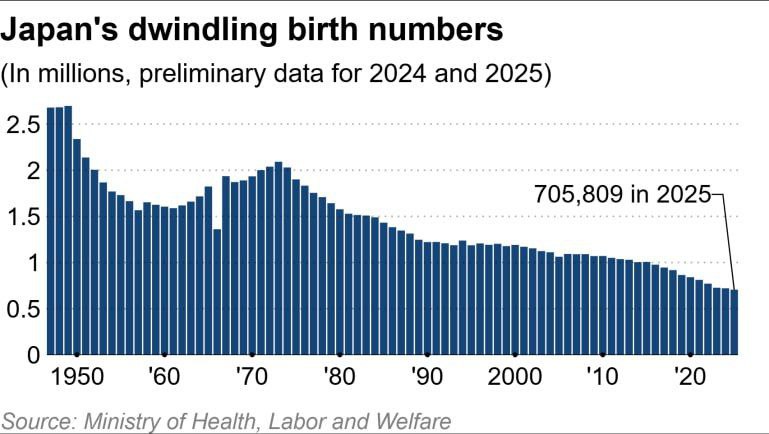 ទិន្នន័យបឋមរបស់ក្រសួងសុខាភិបាលបានបង្ហាញថា ទារកសរុបចំនួន ៧០៥.៨០៩ នាក់បានកើតនៅក្នុងប្រទេសជប៉ុន ដែលធ្លាក់ចុះ ២,១ ភាគរយបើធៀបពីឆ្នាំ ២០២៤។