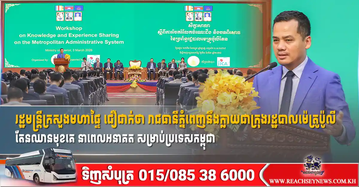 ថ្លែងក្នុងពិធីបើកសិក្ខាសាលា ស្តីពីការចែករំលែកចំណេះដឹង និងបទពិសោធនៃប្រព័ន្ធរដ្ឋបាលម៉េត្រូប៉ូលីតែន នាថ្ងៃទី៣ ខែមីនា ឆ្នាំ២០២៦ នៅទីស្តីការក្រសួងមហាផ្ទៃ លោកឧបនាយករដ្ឋមន្ត្រី បានគូសបញ្ជាក់ថា គ្រប់រាជធានី-ខេត្ត ពីនេះទៅមុខអាចនឹងប្រែក្លាយទៅជារាជធានី-ខេត្តដែលមានប្រព័ន្ធម៉េត្រូប៉ូលីតែន ដើម្បីធានាបាននូវការគ្រប់គ្រងដែនដី ការរៀបចំផែនការអភិវឌ្ឍន៍ និងការផ្តល់សេវាសាធារណៈជូនប្រជាពលរដ្ឋឱ្យកាន់តែមានប្រសិទ្ធភាព តម្លាភាព និងឆាប់រហ័ស។
