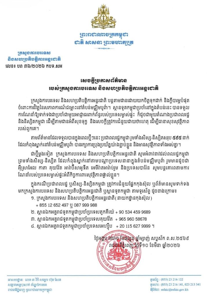 សេចក្តីប្រកាសរបស់ក្រសួងចេញផ្សាយ នៅថ្ងៃ១០ ខែមីនា ឆ្នាំ២០២៦ បានឱ្យដឹងថា ស្ថានទូតកម្ពុជាប្រចាំនៅក្នុងតំបន់មជ្ឈិមបូព៌ាបានទទួលការណែនាំឱ្យទាក់ទងជាប្រចាំជាមួយអាជ្ញាធរពាក់ព័ន្ធរបស់ប្រទេសម្ចាស់ផ្ទះ ក៏ដូចជាមួយតំណាងប្រជាពលរដ្ឋ និងនិស្សិតកម្ពុជា ដើម្បីតាមដានអំពីសុខទុក្ខ និងសេចក្តីត្រូវការជំនួយជាយថាហេតុ ដើម្បីធានាសុខសុវត្ថិភាព របស់ពួកគេ។
