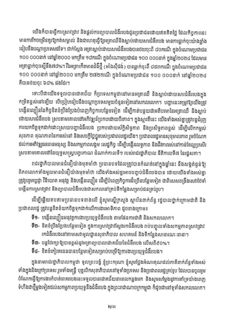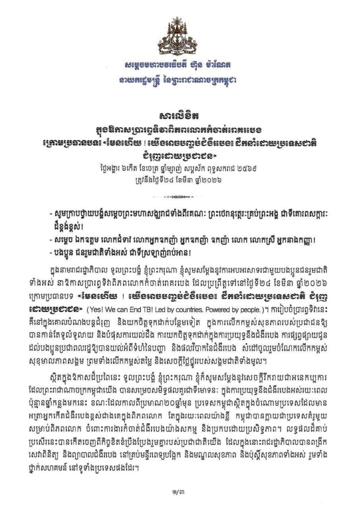 តាមរយៈសារលិខិតរបស់ សម្តេចធិបតី ហ៊ុន ម៉ាណែត ក្នុងឱកាសប្រារព្ធទិវាពិភពលោកកំចាត់រោគរបេង ក្រោមប្រធានបទ «មែនហើយ យើងអាចបញ្ចប់ជំងឺរបេង៖ ដឹកនាំដោយប្រទេសជាតិ ជំរុញដោយប្រជាជន» នៅថ្ងៃទី២៣ ខែមីនា ឆ្នាំ២០២៥ សម្ដេចធិបតី បានឱ្យដឹងថា ជាក់ស្តែង អត្រាស្លាប់ដោយសារជំងឺរបេងបានថយចុះពី ៨០ករណី ក្នុងចំណោមប្រជាជន ១០០ ០០០នាក់ នៅឆ្នាំ២០០០ មកត្រឹម ១៨ករណី ក្នុងចំណោមប្រជាជន ១០០ ០០០នាក់ ក្នុងឆ្នាំ២០២៤ ដែលមាន អត្រាធ្លាក់ចុះស្មើនឹង៧៨%។