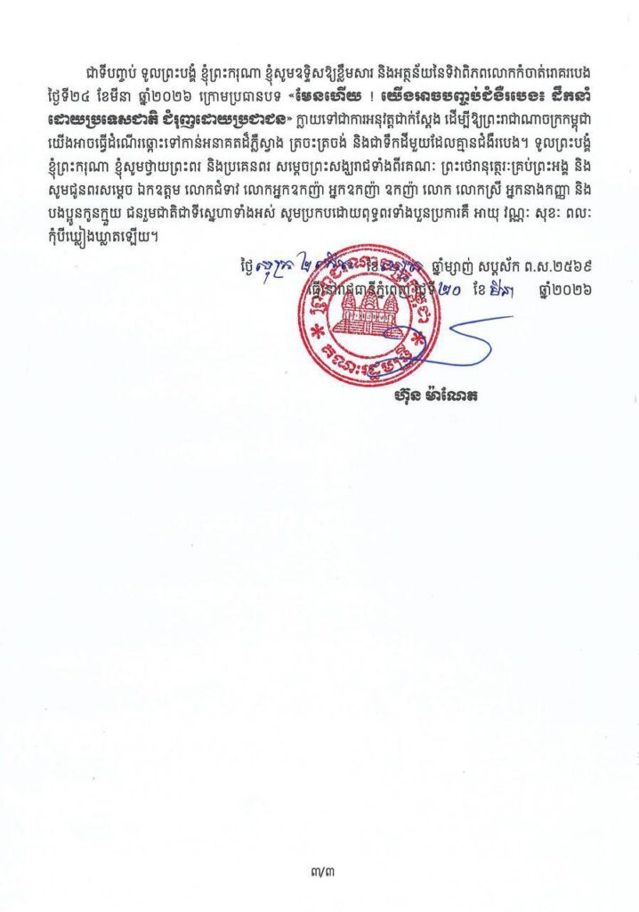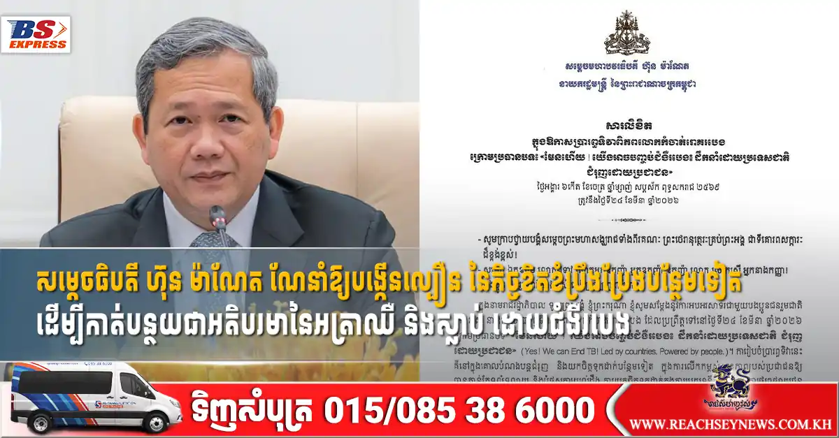 ភ្នំពេញ ៖ សម្តេចមហាបវរធិបតី ហ៊ុន ម៉ាណែត នាយករដ្ឋមន្ត្រីនៃកម្ពុជា បានណែនាំឱ្យបង្កើនល្បឿន នៃកិច្ចខិតខំប្រឹងប្រែងបំពេញកិច្ចការបន្ថែមទៀត ដើម្បីកាត់បន្ថយជាអតិបរមា នៃអត្រាឈឺ និងស្លាប់ ដោយសារជំងឺរបេង ស្របតាមគោលដៅអភិវឌ្ឍន៍ប្រកបដោយចីរភាព។