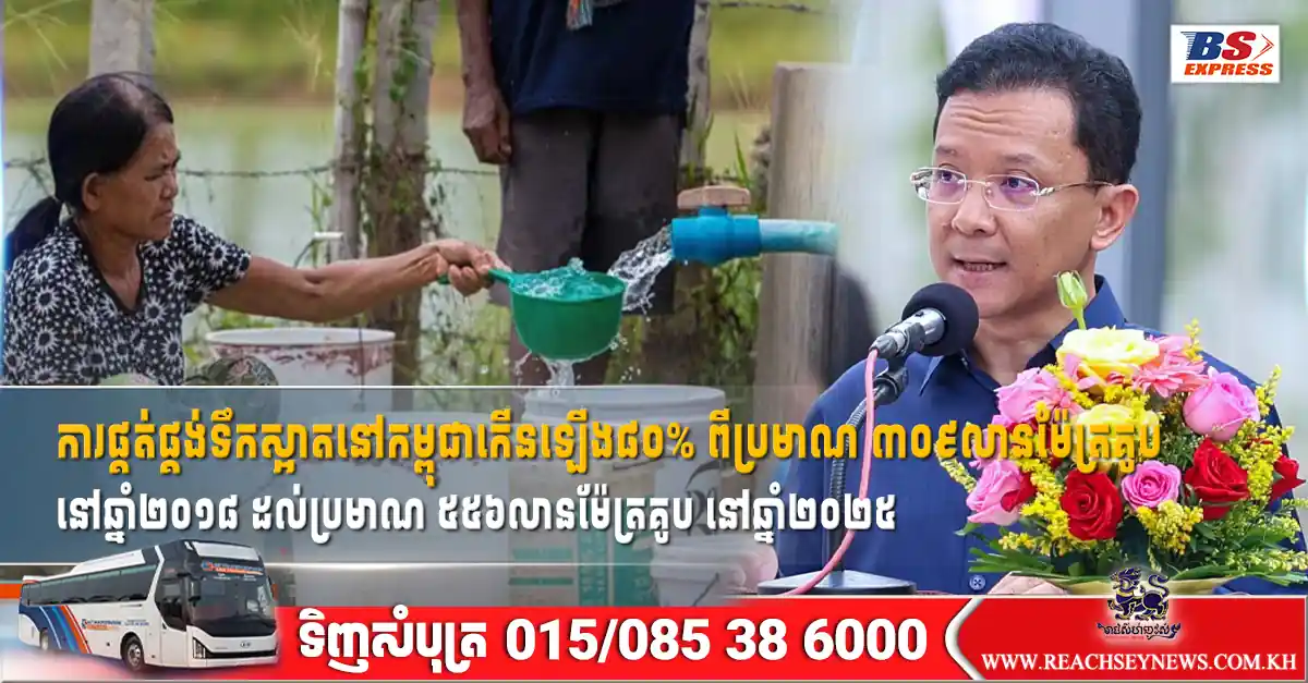 ការផ្គត់ផ្គង់ទឹកស្អាតនៅកម្ពុជាកើនឡើង៨០% ពីប្រមាណ ៣០៩លានម៉ែត្រគូប នៅឆ្នាំ២០១៨ ដល់ប្រមាណ ៥៥៦លានម៉ែត្រគូប នៅឆ្នាំ២០២៥
