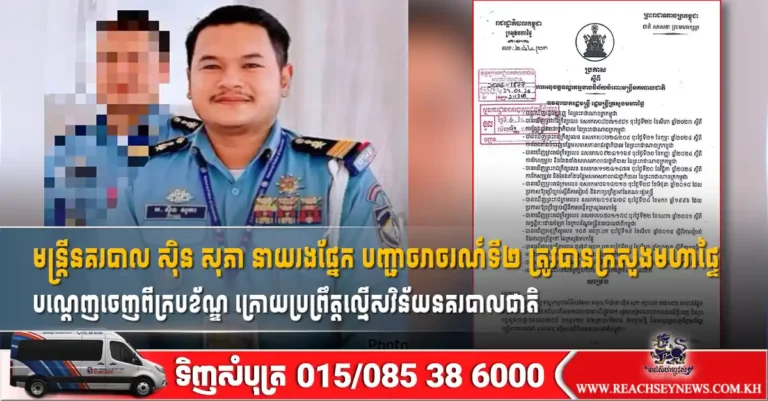 ភ្នំពេញ ៖ លោកឧបនាយករដ្ឋមន្ដ្រី ស សុខា រដ្ឋមន្ដ្រីក្រសួងមហាផ្ទៃ បានចេញសេចក្ដីសម្រេចដាក់ទណ្ឌកម្មខាងវិន័យចំពោះ អនុសេនីយ៍ទោ ស៊ិន សុភា នាយរងផ្នែក បញ្ជាចរាចរណ៍ទី២ នៃការិយាល័យនគរបាលចរាចរណ៍ផ្លូវគោក ស្នងការដ្ឋាននគរបាលរាជធានីភ្នំពេញ ចំណុះអគ្គស្នងការដ្ឋាននគរបាលជាតិ តាមរូបភាព ដកហូតមុខតំណែង ឋានន្តរស័ក្តិ និងបណ្តេញចេញពីក្របខ័ណ្ឌមន្ត្រីនគរបាលជាតិ មូលហេតុ…
