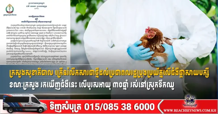 ក្រសួងសុខាភិបាល ក្រើនរំលឹកសារជាថ្មីដល់ប្រជាពលរដ្ឋប្រុងប្រយ័ត្នលើជំងឺផ្តាសាយបក្សី ខណៈក្រសួង រកឃើញជំងឺនេះ លើបុរសអាយុ ៣០ឆ្នាំ រស់នៅស្រុកទឹកឈូ