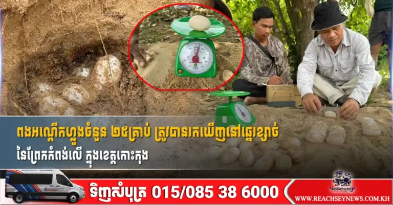 ពងអណ្តើកហ្លួងចំនួន ២៥គ្រាប់ ត្រូវបានរកឃើញនៅឆ្នេរខ្សាច់ នៃព្រែកកំពង់លើ ក្នុងខេត្តកោះកុង
